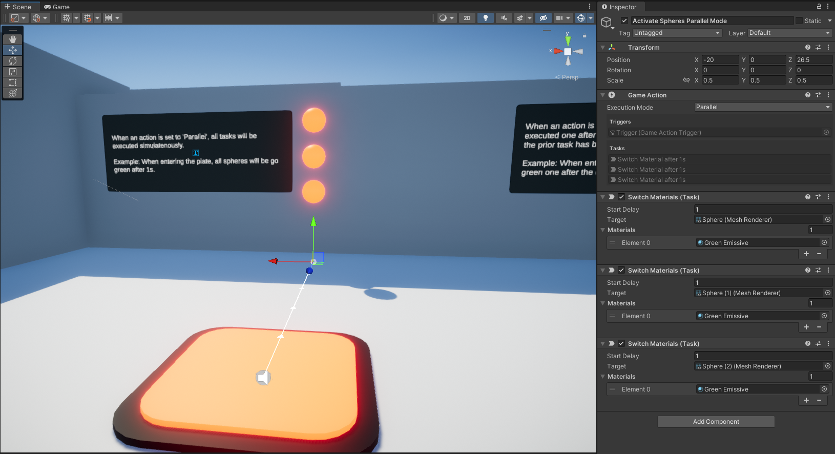 <figure><img src="https://1100255436-files.gitbook.io/~/files/v0/b/gitbook-x-prod.appspot.com/o/spaces%2F5l8cTpzlg0YUsNE93v4P%2Fuploads%2FfvZwIDTXjQLoRaN34XBA%2Fimage.png?alt=media&#x26;token=3258e111-fff3-4b72-ad6e-3d1283ddc8a9" alt=""><figcaption><p>Three tasks with a delay of 1 second. Each task will switch the material of a sphere to green. As the Game Action is set to Parallel, all tasks will be executed after 1 second.</p></figcaption></figure>